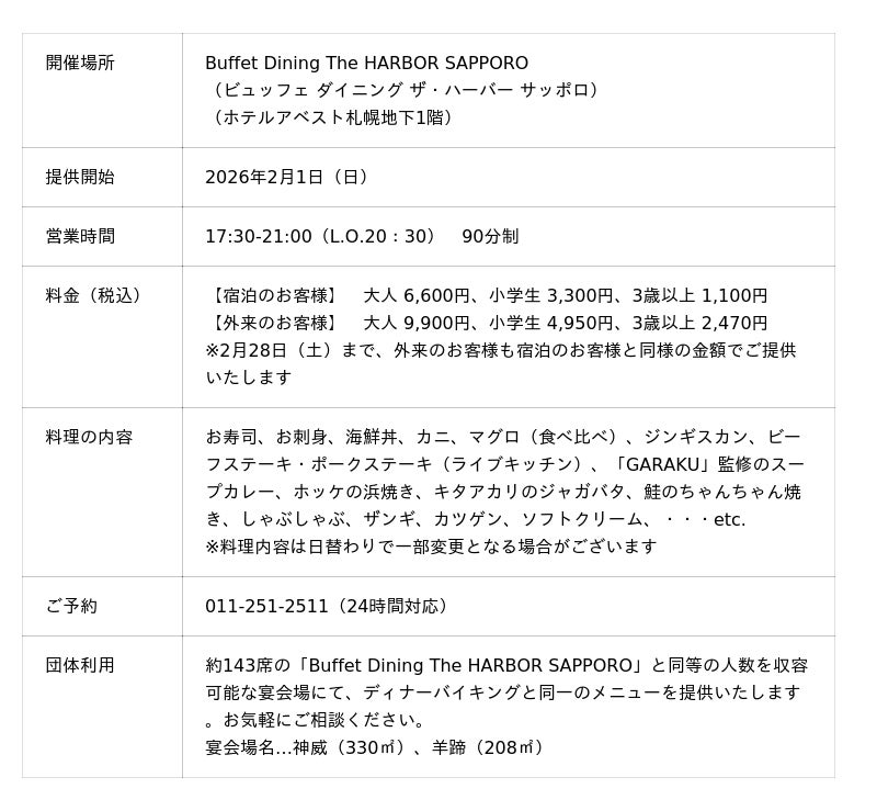 2021年7月に開業したホテルアベスト札幌では、北海道らしい海鮮やジンギスカン、季節感のあるお料理などを取り揃えた朝食バイキングを展開しており、多くの宿泊者から好評を博しています。このたび、当ホテル自慢の食材や料理を朝食だけでなく、夕食でも食べ放題で楽しんでいただきたいとの思いから、ディナーバイキングの提供を決定しました。狸小路周辺ではほとんどみかけない、カニ・海鮮・お肉・北海道料理が一堂に会する、まさに"北海道をぎゅっと詰め込んだ"バイキングです。モーニングに加えてディナーのバイキング営業にも対応するべく、これまで朝食会場として利用していたB1階「アリタリア」は2025年7月より実施していた工事により内装・設備を一新し、ディナーバイキング開始日の2026年2月1日(日)から店名を「Buffet Dining The HARBOR SAPPORO(ビュッフェ ダイニング ザ・ハーバー サッポロ)」へと改めてリニューアルオープンしました。真新しく生まれ変わったビュッフェレストランで、豪華なメニューが並ぶ朝夕のバイキングを快適にお楽しみいただけます。