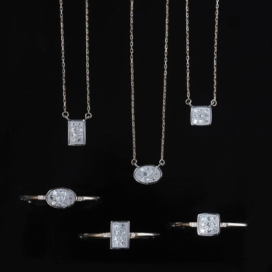 8ファセットカットのダイヤモンドを用いたリングおよびペンダントも登場いたします。17面体に整えたダイヤモンドは、一般的なブリリアントカットと比べて一面ごとの広がりがあり、白く澄んだ輝きが印象的です。プラチナの土台に泡留めを施すことで光を多く取り込み、端正な煌めきを引き出した仕立てとなっております。