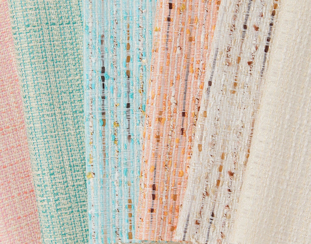 彩り豊かな色彩と立体的な織りが印象的なトゥモローランドオリジナルのファンシーツイード素材。今回のオーダー会のために人気のシリーズをご用意いたしました。装いにそっと品のある華やぎを添える表情に仕上げています。