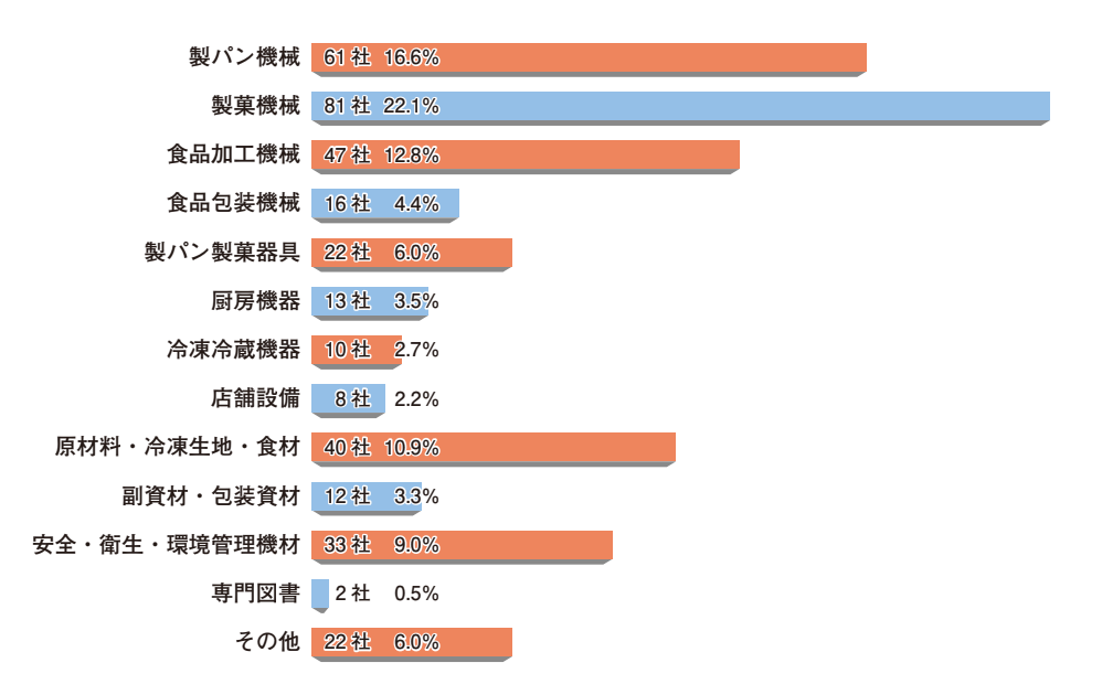出品類分類としては、製パン機械・製菓機械・食品加工機械・食品包装機械など、機械関係が55.9%、その他にも店舗設備・原材料・副資材・安全・衛生・環境管理機材などが25.4%となり、出品製品の多様化と専門展化がさらに進んでいることがわかります。