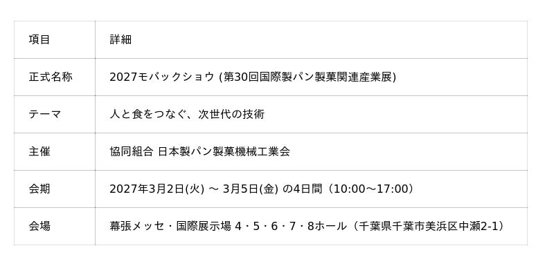モバックショウ(MOBAC SHOW)は、2年に1度開催される製パン・製菓業界で国内最大、アジアでも屈指の規模を誇る総合専門展示会です。本展は今回で第30回の節目を迎え、最新の技術と情報が一堂に会します。