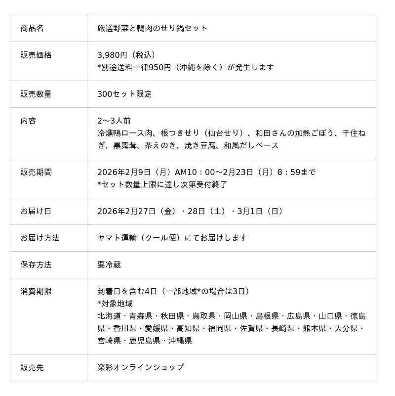 d130004-125-bd0a8573f1e817a88f2d6785fc96360b.pdf 楽彩株式会社(本社:東京都足立区/代表取締役社長:大崎善保)は、2026年2月9日(月)の「肉の日」より、昨年11月の発売時に完売となった大人気商品『厳選野菜と鴨肉のせり鍋セット』を、楽彩オンラインショップにて300セット限定で予約販売いたします。本商品は、「仙台せり」を根まで贅沢に使用し、旨味あふれる鴨肉と合わせたこだわりの逸品です。「もう一度食べたい」という多くのお客様からの熱いご要望にお応えし、まだまだ寒さが厳しいこの季節に、心も体も温まるプロの味を、ミールキットの手軽さはそのままにご家庭へお届けいたします。