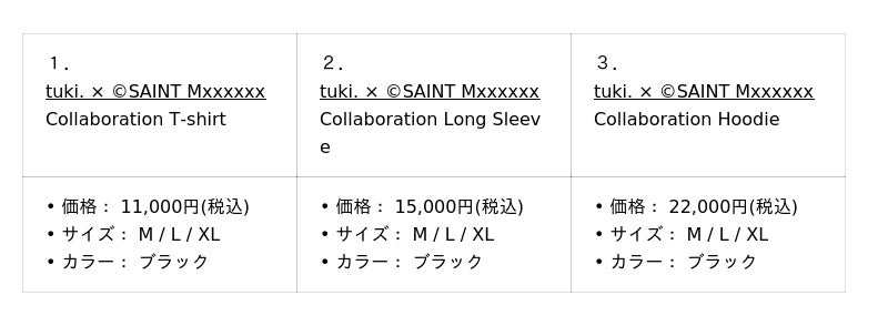 上記3アイテムのうち、「tuki. × (C)SAINT Mxxxxxx Collaboration T-shirt」は、2026年2月11日(水・祝)に開催されるtuki.初の日本武道館ワンマンライブ の会場物販にて、13:00より数量限定で販売を開始いたします。また、2026年2月13日(金)18:00より、他2アイテムも含めtuki.オフィシャルオンラインストアにて通信販売も実施予定です。
