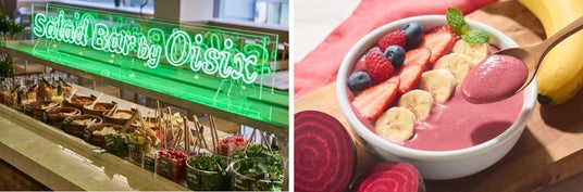 ▲人気の「Oisixサラダバーコーナー」(左)が期間中はピンク色で賑やかに、【砂糖不使用】おうちで食べる!ビーツボウル