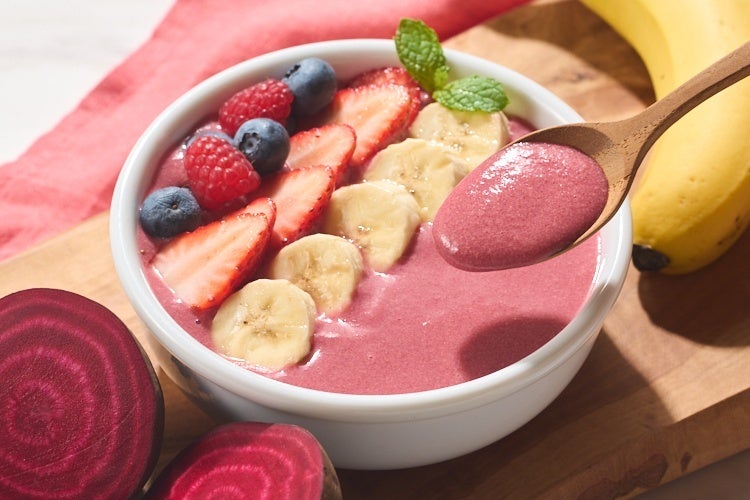 概要:栄養価の高いビーツのペースト、バナナ、豆乳、味わいのアクセントにラズベリーを使い、砂糖不使用で仕上げました。(ビーツペースト:仕込み時で21.5%配合) フルーツ由来の甘さがしっかりあるので、そのままスムージーとしても、ヨーグルトとフルーツにのせてビーツボウルにしてもおすすめです。