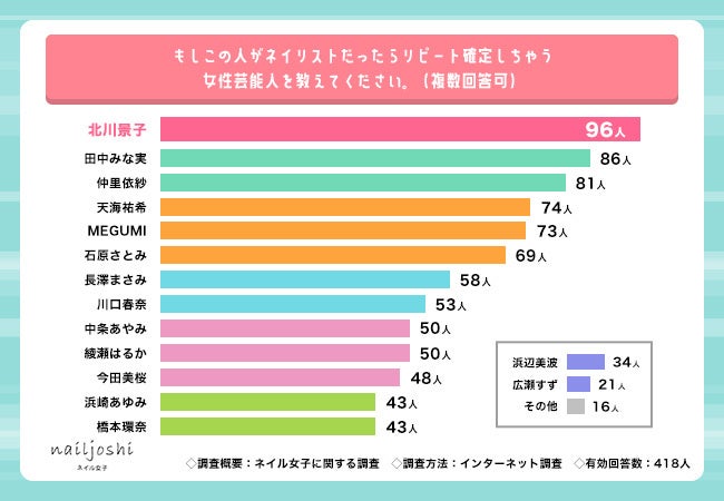 次に「もしこの人がネイリストだったらリピート確定しちゃう女性芸能人を教えてください(複数回答可)」と質問したところ、北川景子さん(96人)が第1位を獲得しました。続いて田中みな実さん(86人)が第2位、仲里依紗さん(81人)が第3位となっています。