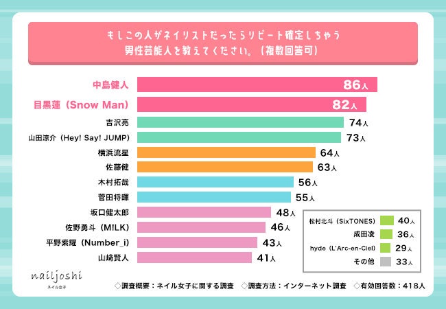 次に「もしこの人がネイリストだったらリピート確定しちゃう男性芸能人を教えてください」(複数回答可)と質問したところ、中島健人さん(86人)が第1位を獲得しました。続いて目黒蓮さん(82人)が第2位、吉沢亮さん(74人)が第3位となっています。