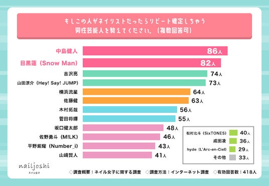 ・もしこの人がネイリストだったらリピート確定の男性芸能人、1位は『中島健人』(86人)、2位『目黒蓮』(82人)、3位『吉沢亮』(74人)