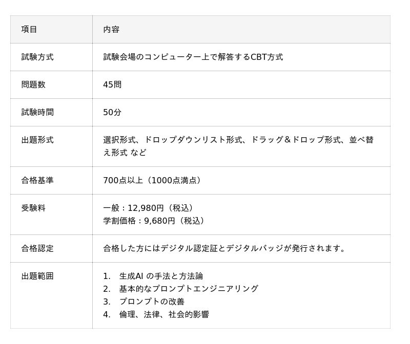 『Generative AI Foundations』は、生成AIの基本知識や応用スキル、倫理的な運用について理解していることを証明できる試験です。試験範囲には、生成AIを活用する上で欠かせない基本的なプロンプト設計や改善の方法も含まれており、学生・社会人を問わず、これから生成AIを活用した学びやキャリアを広げたい方に最適な入門試験です。