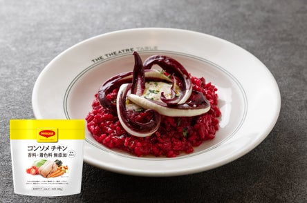 "マギー コンソメ チキン 香料・着色料 無添加"と、ローストビーツのうま味が調和したリゾットです。