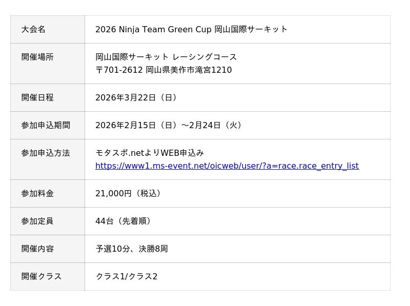 株式会社カワサキモータースジャパン(本社:兵庫県明石市、代表取締役社長:佐伯 健児)は、2026 Ninja Team Green Cup 岡山国際サーキット のエントリー受付を2026年2月15日(日)より開始いたします。