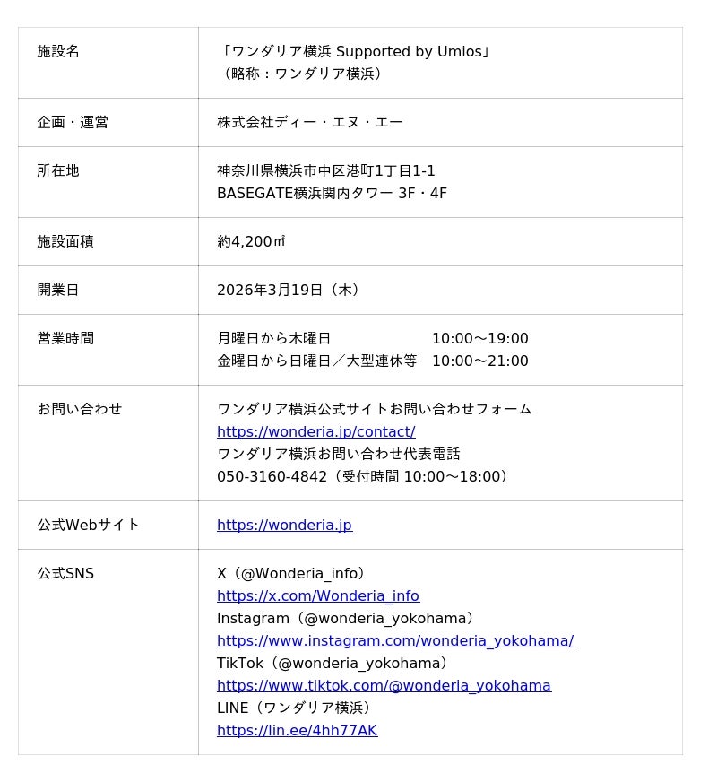 株式会社ディー・エヌ・エー(本社:東京都渋谷区、代表取締役社長兼CEO:岡村信悟、以下 DeNA)は、2026年3月19日(木)に大規模複合街区「BASEGATE横浜関内」にて開業する没入型体験施設「ワンダリア横浜 Supported by Umios」(以下、ワンダリア横浜)について、本日2月10日(火)から公式サイトにてチケット販売を開始します。