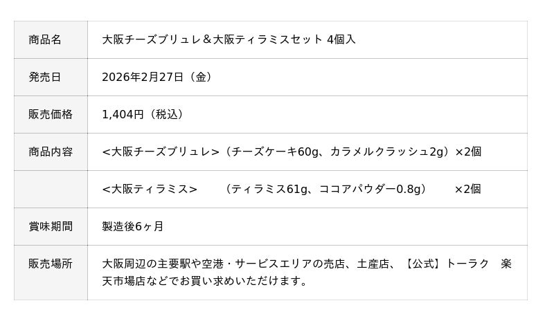 トーラク株式会社(本社:兵庫県神戸市東灘区向洋町西5丁目5番、代表取締役社長:毛利 功一郎)は、「大阪チーズブリュレ&大阪ティラミスセット 4個入」 を2026年2月27日(金)より発売いたします。