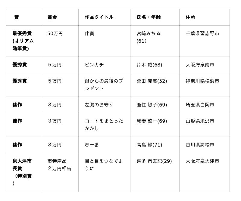 今回は全国から408点の応募があり、作家の有栖川有栖氏、玉岡かおる氏、吉村萬壱氏、女優・エッセイストの室井滋氏の4名による選考委員会を経て、最優秀賞(オリアム随筆賞)を含む計7作品を選出しました。