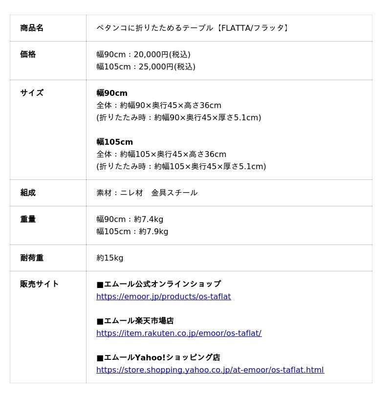 健康家具ブランドEMOOR(エムール)は、ペタンコに折りたためるテーブル『FLATTA(フラッタ)』の販売を開始しました。スぺパな暮らしにぴったりな折りたたみテーブルです。