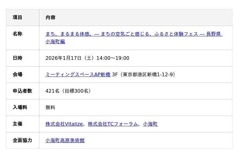 株式会社Vitalize(本社:東京都新宿区、代表取締役CEO:道畑健輔・代表取締役COO/小海支社長:濱野史明)、株式会社TCフォーラム(本社:東京都新宿区、代表取締役社長:寺島陽一郎)、小海町(町長:黒澤弘)の3者は、2026年1月17日(土)、東京・新橋にて「まち、まるまる体感。- まちの空気ごと感じる、ふるさと体験フェス - 長野県 小海町編」を開催いたしました。