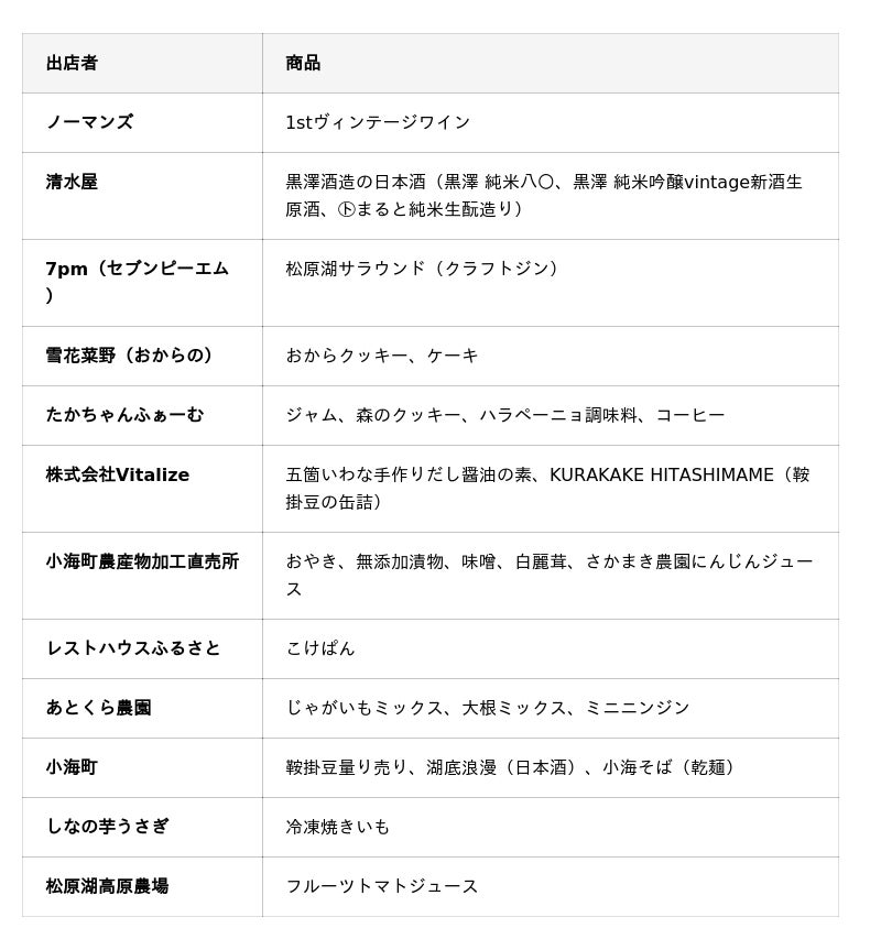 12店舗が出店し、小海町ならではの特産品の試食・販売を提供。来場者アンケートで最も人気のコンテンツ(50%)となりました。