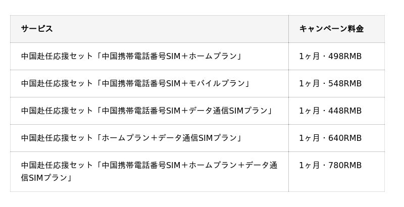 ◆中国赴任応援キャンペーン開始!お得なセットプラン料金