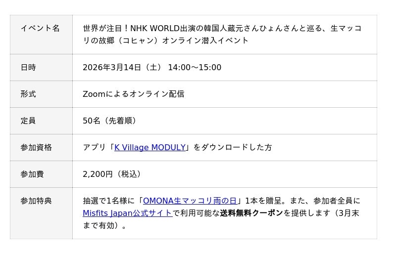 日本最大級の韓国語教室「K Village 韓国語」を運営する株式会社K Village(本社:東京都新宿区、代表取締役社長:桑原 元就)は、2026年3月14日(土)、島根県雲南市で「OMONA生マッコリ雨の日」を醸造する韓国人蔵元、そん さんひょん氏をゲストに迎え、醸造場の内部を生中継で案内するオンラインイベントを開催します。