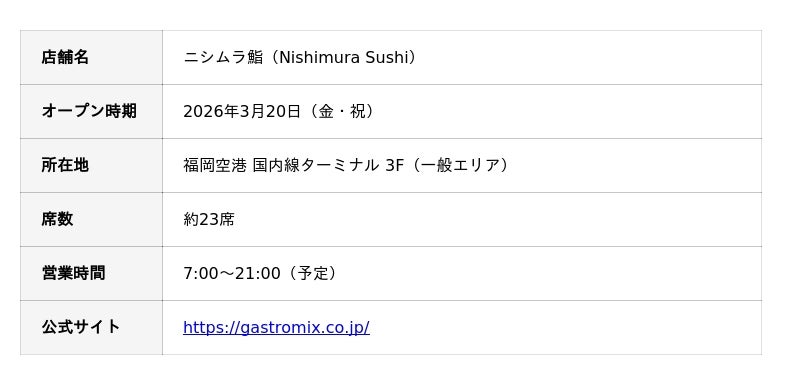 株式会社Gastromix(所在地:福岡県福岡市、代表取締役:堀池広樹)は、2026年3月20日(金・祝)、福岡空港 国内線ターミナル内に、ミシュランガイド一つ星獲得店を率いた西村貴仁による新業態「ニシムラ鮨(Nishimura Sushi)」をオープンいたします。