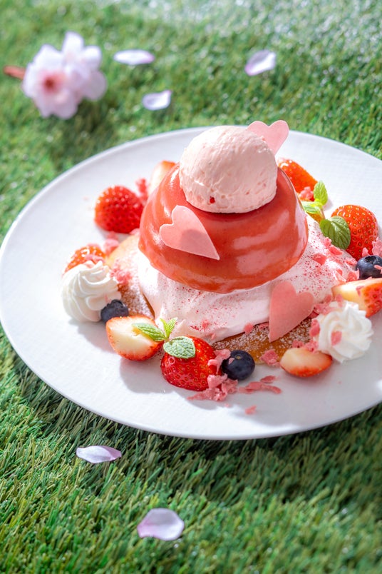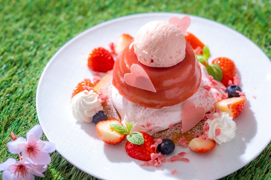「さくらといちごのスプリングドーム」は、たっぷりの苺ホイップクリームを添えた、もっちり食感のパンケーキの上に桜の香りをまとった軽やかなスフレパンケーキを重ね、苺のアイスミルクをトップにあしらったドーム仕立てのプレートデザートです。ドームを開くと中に隠れていた苺ソースがとろりとあふれ出し、パンケーキに絡むことで華やかな味わいの変化を愉しめます。ひと口ごとに心までほぐれるような、ときめきに満ちた春のデザートです。