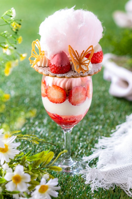 「いちごとフワフワわたがしパフェ」は、ふんわりとしたわたがしと蝶々のクッキーをトップにあしらった、春風がそよぐ情景を思わせる華やかなパフェです。わたがしの下にはピンク・白・若草色の3色のチョコレートをまとった苺が並び、お好みで苺ソースをかけると見た目と味わいの2種類の変化を愉しめます。グラスの中には、ピスタチオのアイスジェラート、フロマージュブランのムース、そして苺の美しい断面などが重なり、繊細な層を描きます。バラの香りをまとったゼリーと苺のピューレが混ざり合い、春の香りと余韻を口いっぱいに感じられるグラスパフェに仕上げました。