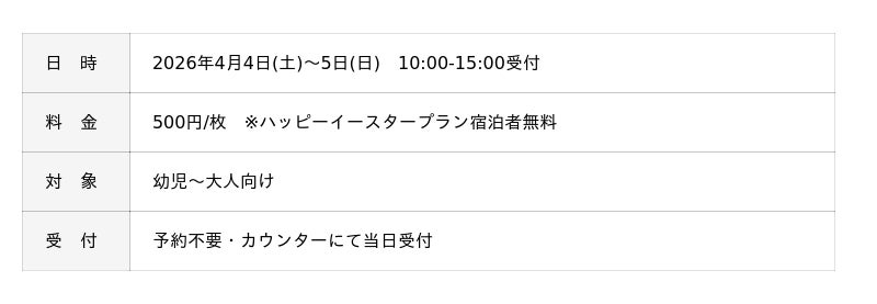 ■移動祝祭日: イースターは「春分後の最初の満月の次の日曜日」と定められており、毎年日付が変わる移動式祝日です。2026年は4月5日(日)がその当日にあたります。復活祭の翌日は「イースターマンデー」と呼ばれ、英国国を含むいくつかの国では祝日として親しまれています。ブリティッシュヒルズではイベントを通して、気軽にイースター文化に触れることが出来ます。