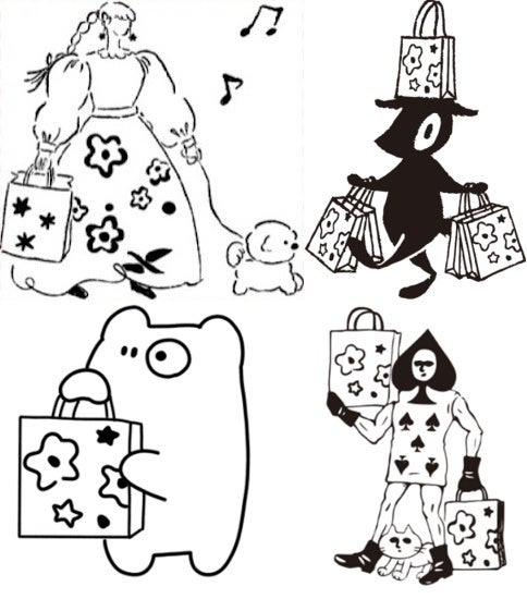 (左上)「はんこどり」花柄さんぽ990円、(右上)「もりりんご」かいすぎちゃった990円、(左下)「あいの紙ものやさん」おかいものくま990円、(右下)「Redbug」買物トランプ兵990円 ※一部ブランドの売場入場について、2月16日(月)のみ午前10時15分~午後4時10分までは事前予約(抽選)が必要です。