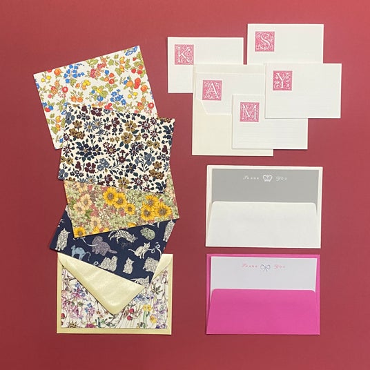 「EAST TOKYO STUDIO」リバティプリント生地貼りレターカード385円、刻印印刷のサンキューレターカード396円、活版イニシャルカードセット(A/E/H/K/M/N/R/S/T/Y)各660円 ◎9階 祝祭広場