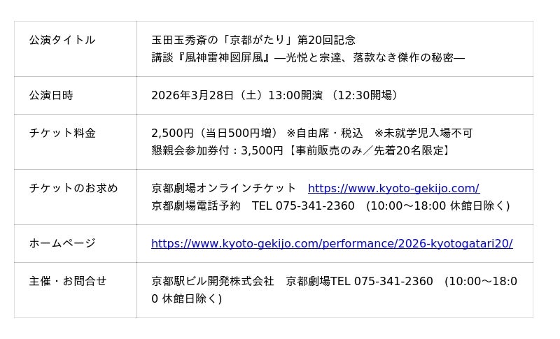 記念すべき第20回では、初回公演で好評を博し、幻の第1回目として再演のご要望も多かった題材、講談『風神雷神図屏風』を再演。二人の天才にまつわる日本美術史のミステリーを、玉田玉秀斎が語ります。さらに、京都の歴史文化に精通する「らくたび」代表・若村亮氏による、ゆかりの地の解説も併せてお楽しみいただけます。