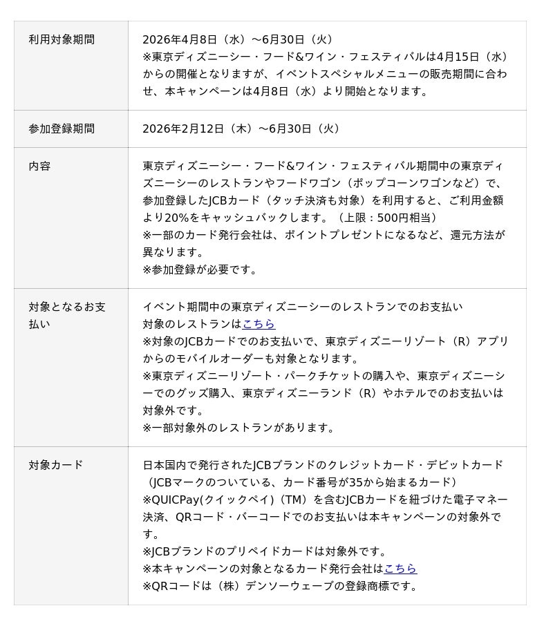 株式会社ジェーシービー (本社:東京都港区、代表取締役会長 兼 執行役員社長:二重 孝好、以下:JCB)は、2026年4月8日(水)から6月30日(火)まで、「JCB キャッシュバックキャンペーンin 東京ディズニーシー・フード&ワイン・フェスティバル」を実施します。
