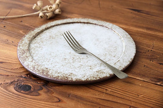 シンプルで使い勝手のよい形と、アンティークのような風合いが料理を引き立てるプレート。