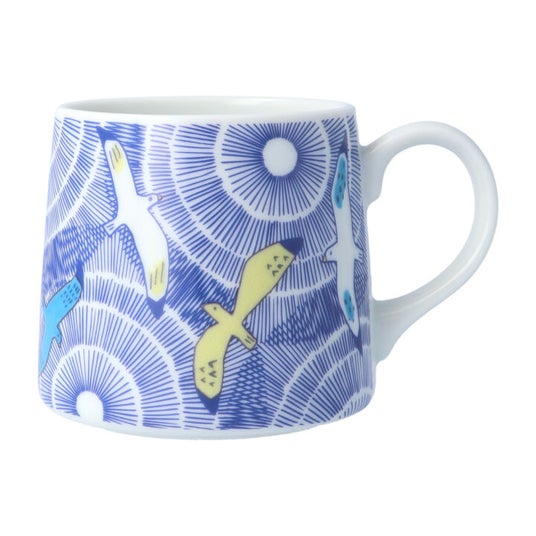 線を連ねた印象的な背景に、色とりどりのカモメが飛び交う、モダンアートのような雰囲気が漂うマグカップ。