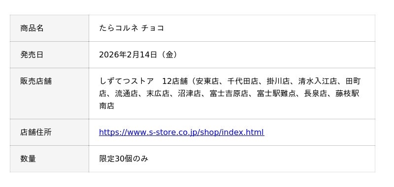 明太子の老舗「ふくや」を中心とするふくやグループの株式会社ヤマトバイオレッツ(本社:福岡県大野城市/ふくやグループ/代表取締役:梁川 剛一)は、バレンタインデー限定商品として、「生のたらこに具材を入れる技術」を活用した商品「たらコルネ」シリーズ初のスイーツフレーバー「たらコルネ チョコ」を、2026年2月14日(金)より、しずてつストア(静岡県内12店舗)にて限定30個のみ発売いたします。