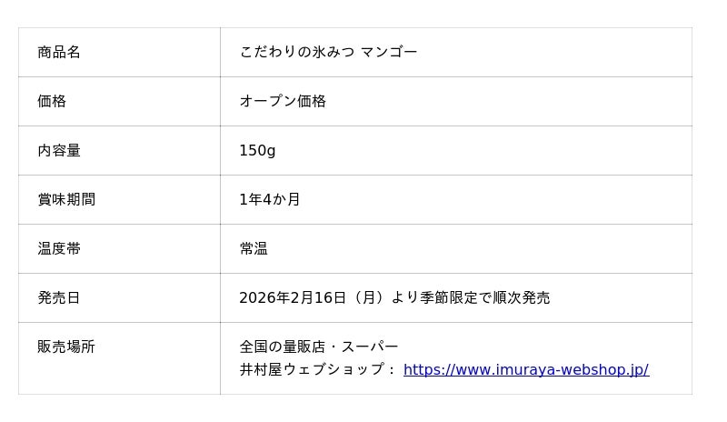 井村屋株式会社(本社:三重県津市高茶屋七丁目1番1号、社長:岩本 康)は、マンゴーの王様と呼ばれる「アルフォンソマンゴー」のピューレを使用した濃厚な味わいが楽しめる『こだわりの氷みつ マンゴー』を、2026年2月16日(月)より季節限定で順次発売します。