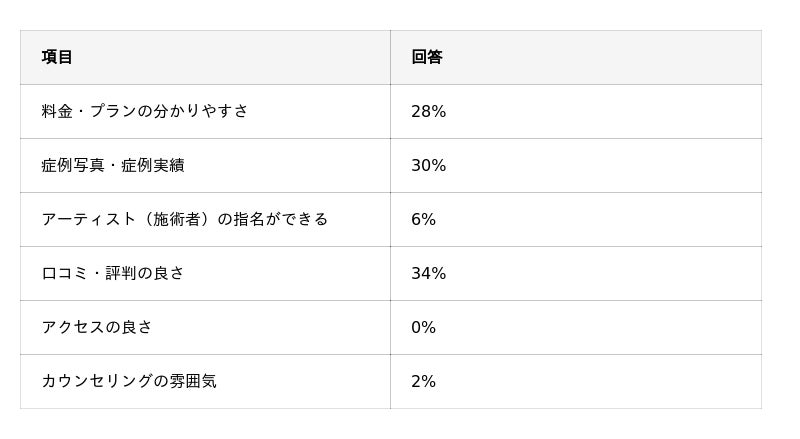 - クリニックを選ぶ際は「口コミ・評判の良さ」(34%)、「症例写真・症例実績」(30%)、「料金・プランの分かりやすさ」(28%)を重視すると回答した人が多い