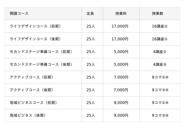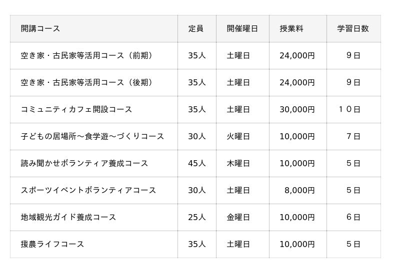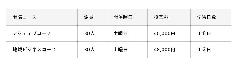NPOやボランティア団体の立ち上げと運営を学ぶ「アクティブコース」、ソーシャルビジネスの起業と経営を学ぶ「地域ビジネスコース」があります。