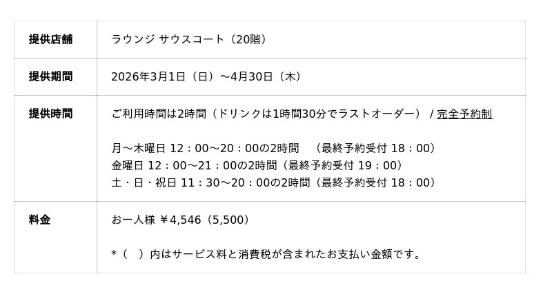 「小田急ホテルセンチュリーサザンタワー」(所在地:東京都渋谷区代々木2-2-1、総支配人:宮越 真理子)内、「ラウンジ サウスコート」では、淡いピンク色のスイーツや春野菜のセイボリーをラインアップした「桜のスプリングアフタヌーンティー」を、2026年3月1日(日)から4月30日(木)までの期間限定・完全予約制にて提供いたします。