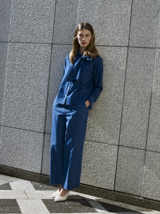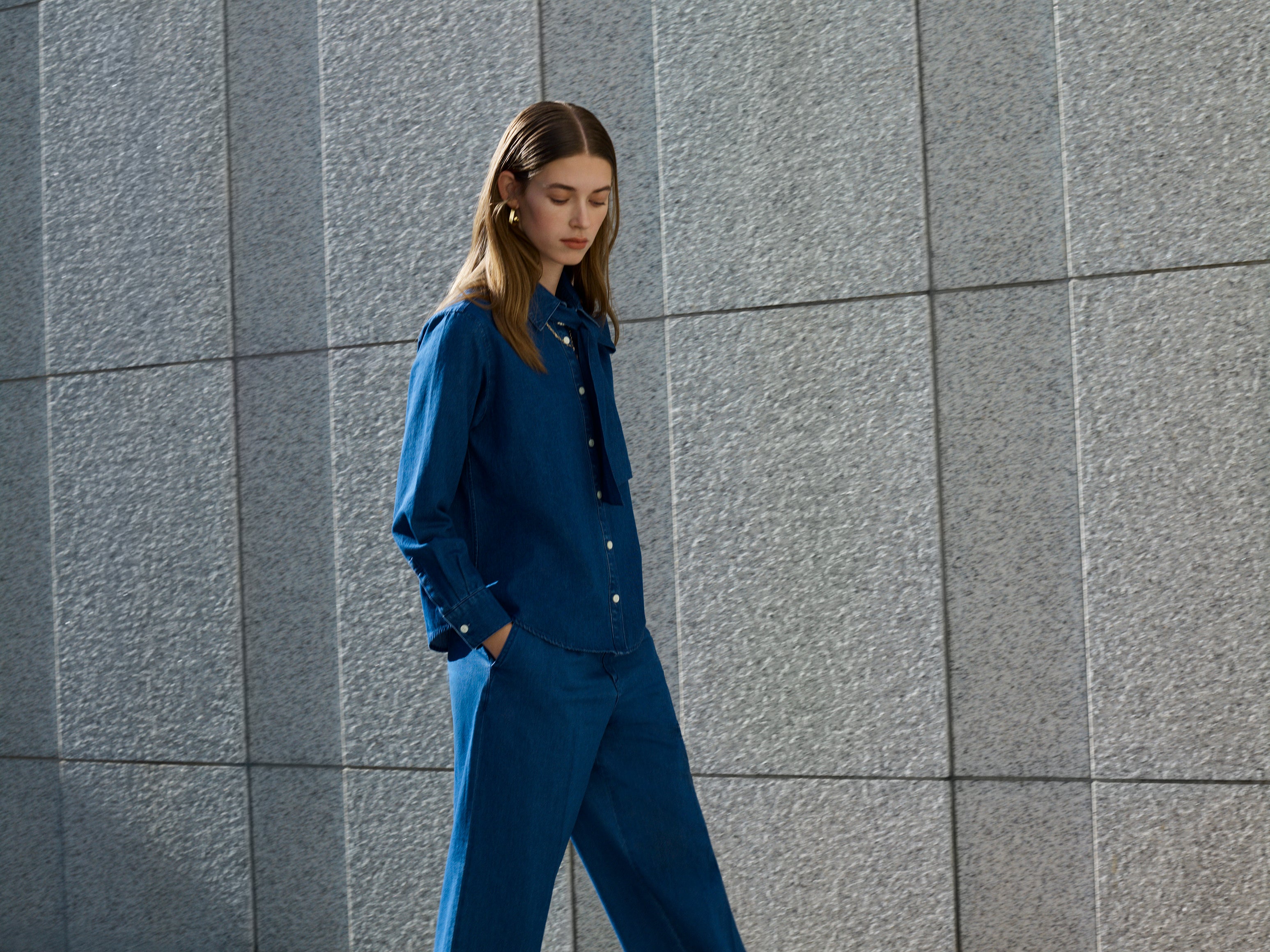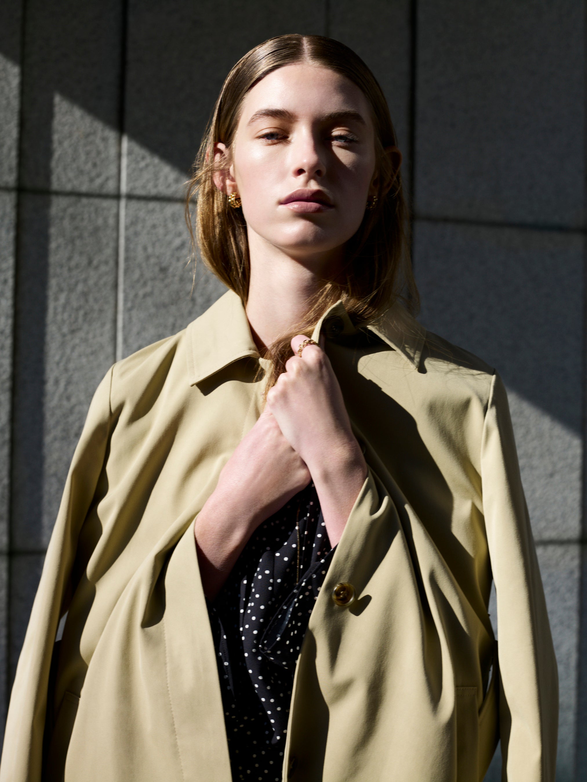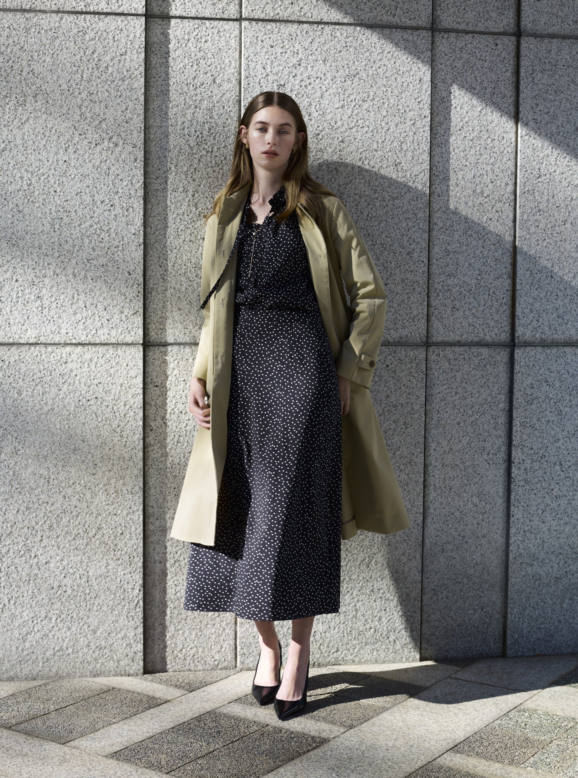 今季のコレクションでは、デニムをメインにしたトレンド感と鮮度のあるスタイリングをはじめ、ドット柄のブラウスとスカートのセットアップや、ステンカラーのトレンチコートなど、洗練された印象のアイテムが多数ラインナップ。