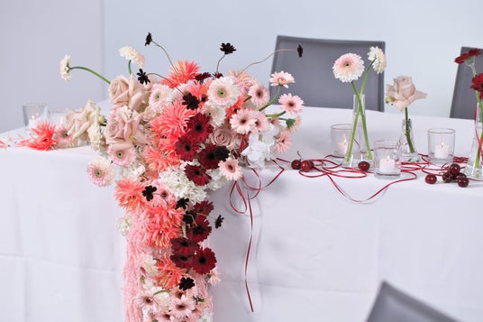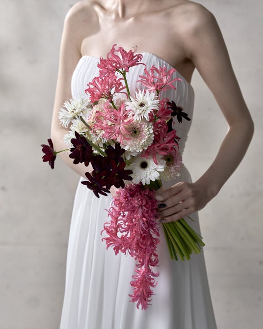 トレンド予測で上位となった「スイート」の甘く優しい世界観にビターなアクセントをプラス。 スパイダー咲きやポンポン咲きなど異なる咲き方のガーベラをMIXし、チョコレートコスモスやガーベラのしなやかな茎の動きを見せることでトレンド感のあるデザインに仕上げました。