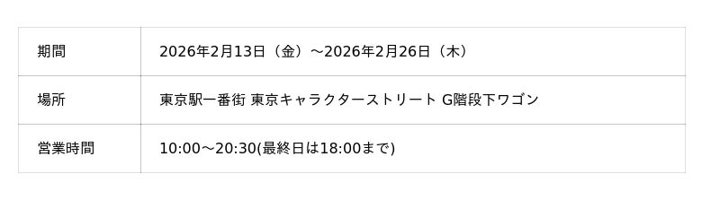 2026/2/13(金)~2026/2/26(木) 東京駅一番街東京キャラクターストリート G階段下ワゴン