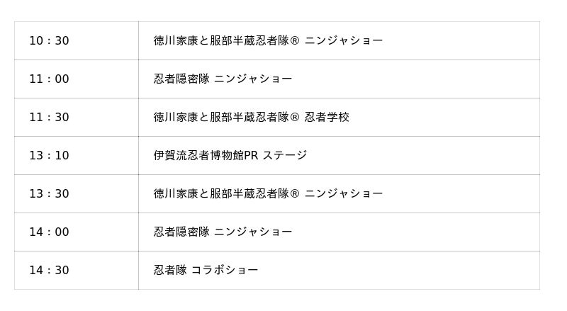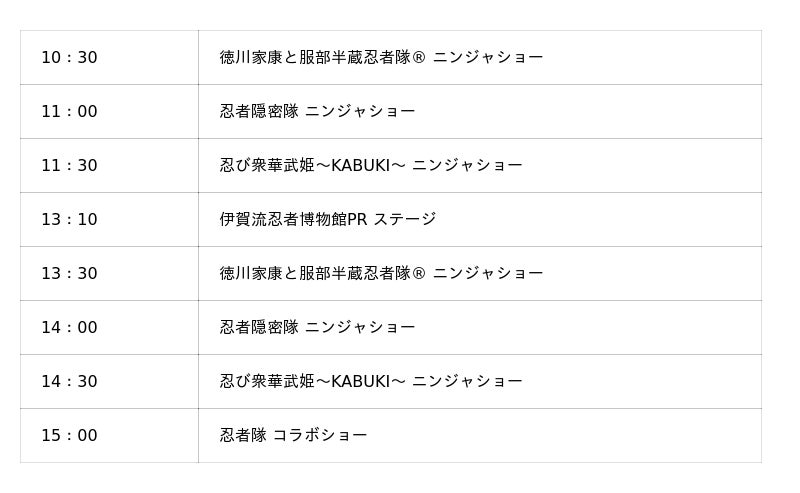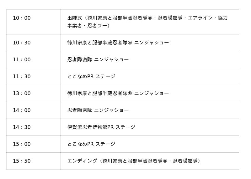 イベントステージにて、「徳川家康と服部半蔵忍者隊」、「忍者隠密隊」、空港スタッフによる出陣式や、「忍び衆華武姫~KABUKI~」によるニンジャショーなどを行い忍者の魅力を発信します。