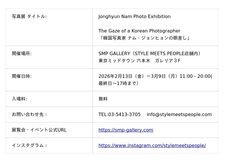 SMP GALLERYでは、こうした潮流を一過性のブームとして捉えるのではなく、個々の作家が長年培ってきた表現や思想に丁寧に向き合い、作品そのものが持つ静かな力を紹介することを大切にしています。本展は、韓国写真表現の現在地を示すと同時に、文化や国境を越えて共有される「見る」という行為の豊かさを、写真家 ナム・ジョンヒョンの眼差を通し、あらためて問いかける機会となることを目指しています。