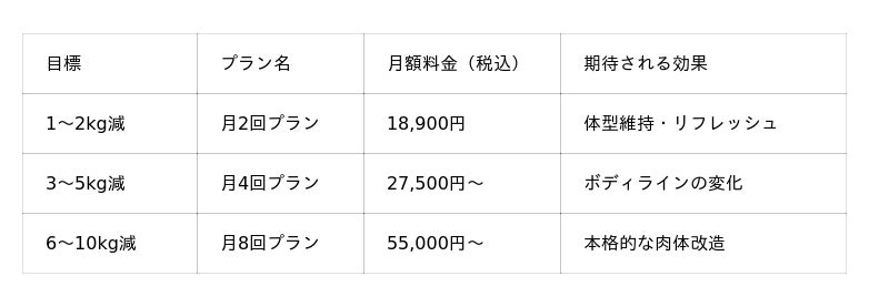 - 心理的ハードルの払拭(選べる目標別プラン) 「1~2kgだけ整えたい」から「6~10kgの本格ボディメイク」まで、一人ひとりの今の心境に寄り添うプラン展開により、ジム通いへの精神的なハードルを下げます。