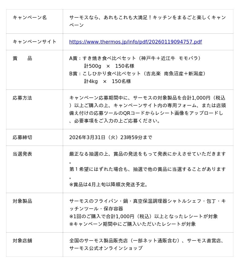 サーモスのフライパンや包丁などのキッチン製品を購入して応募!神戸牛&近江牛やお米食べ比べセットなどの豪華グルメが合計300名様に当たる キャンペーン応募期間:2026年3月31日(火)まで