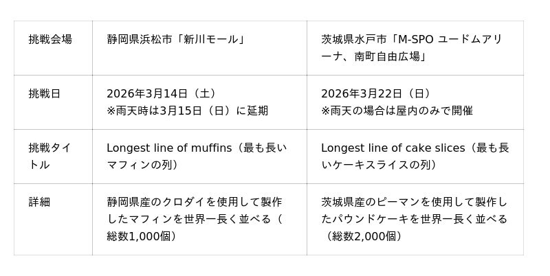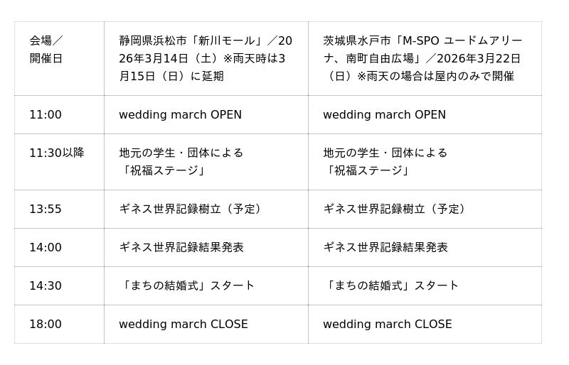 株式会社ウエディングパーク(本社:東京都港区、代表取締役社長:日紫喜 誠吾)は、2026年3月、静岡県浜松市および茨城県水戸市にて、地域共創型イベント「wedding march ー まちを、もっと幸せにしよう。(以下、wedding march 2026)」を開催いたします。 本イベントの目玉として、各地域の「課題食材」を活用したウエディングケーキを製作し、本プロジェクト初の「ギネス世界記録(TM)」へ挑戦いたします。
