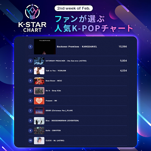 『K-STAR CHART presents POP-K TOP10 Friday』週間チャートで見事1位に輝いたのは、KANGDANIELの「Backseat Promises」です。先週の8位から大幅にランクアップし、初となる1位を獲得しました。先週月曜日(2/9)に入隊した彼へ贈る、ファンの熱いエールが形となった結果と言えるでしょう。