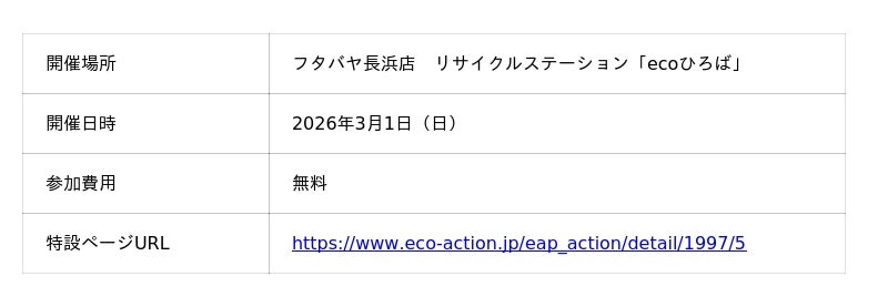 ティーエムエルデ株式会社(以下、当社)(本社:滋賀県長浜市、代表取締役社長:高橋康之)は、株式会社フタバヤ(以下フタバヤ)と株式会社エフピコ(以下、エフピコ)と共同で、地域の皆さまに身近なプラスチック資源循環への理解を深めていただくことを目的とした環境イベントを、2026年3月1日(日)にフタバヤ長浜店にて開催いたします。
