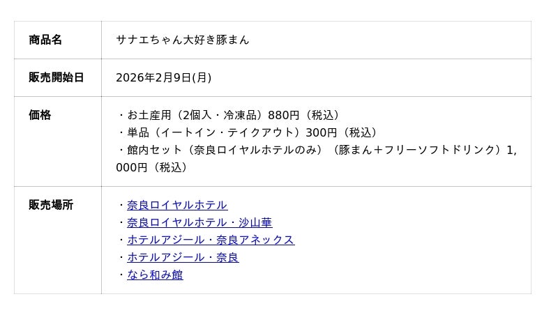 株式会社ワールド・ヘリテイジ(奈良市高畑町 代表:東 正教)が運営する奈良市内のホテルおよび観光施設にて、2026年2月9日(月)より、「サナエちゃん大好き豚まん」 の販売を開始いたしました。