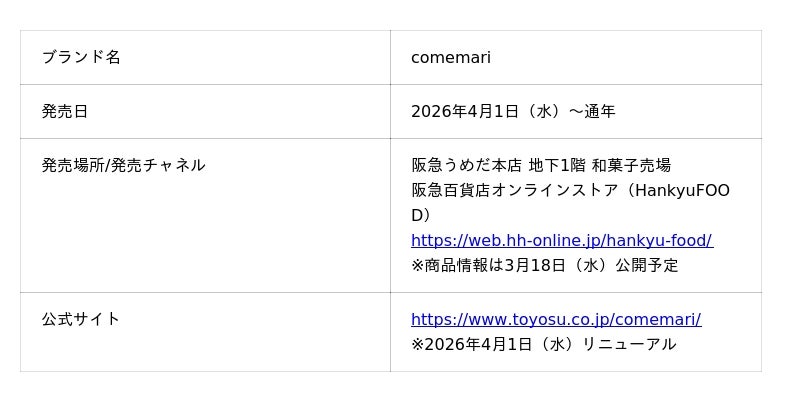 とよす株式会社(本社:大阪府池田市 社長:眞田 昌彦)は、阪急うめだ本店 地下1階 和菓子売場に展開しているお米のスナック専門店「comemari」を、2026年4月1日(水)にブランドリニューアルいたします。